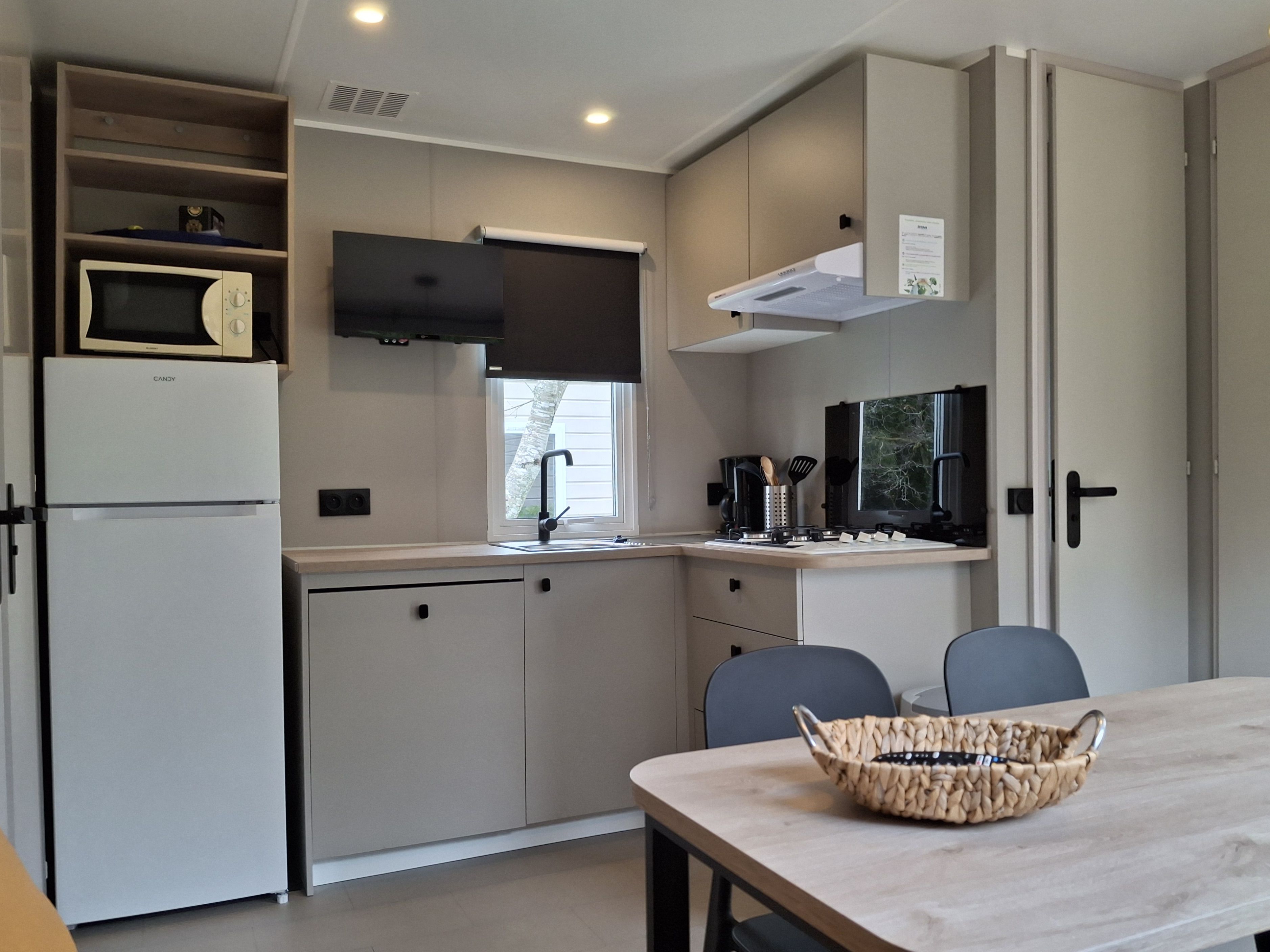 - woonkamer/keuken met koel/vries combi, magnetron en vaatwasser,